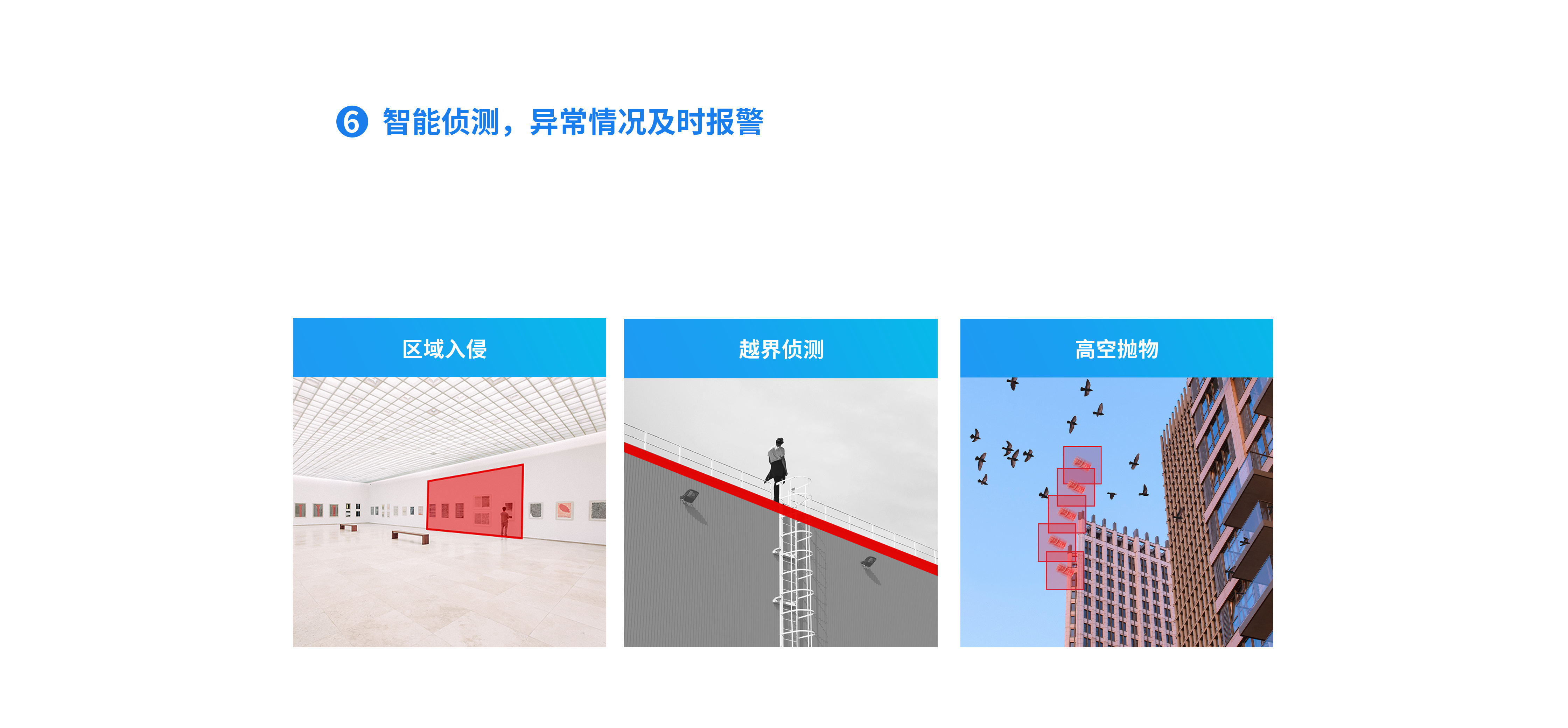 区域入侵、越界侦测、高空抛物、人形/车辆/响声侦测(车辆鸣笛和爆炸)等多种警