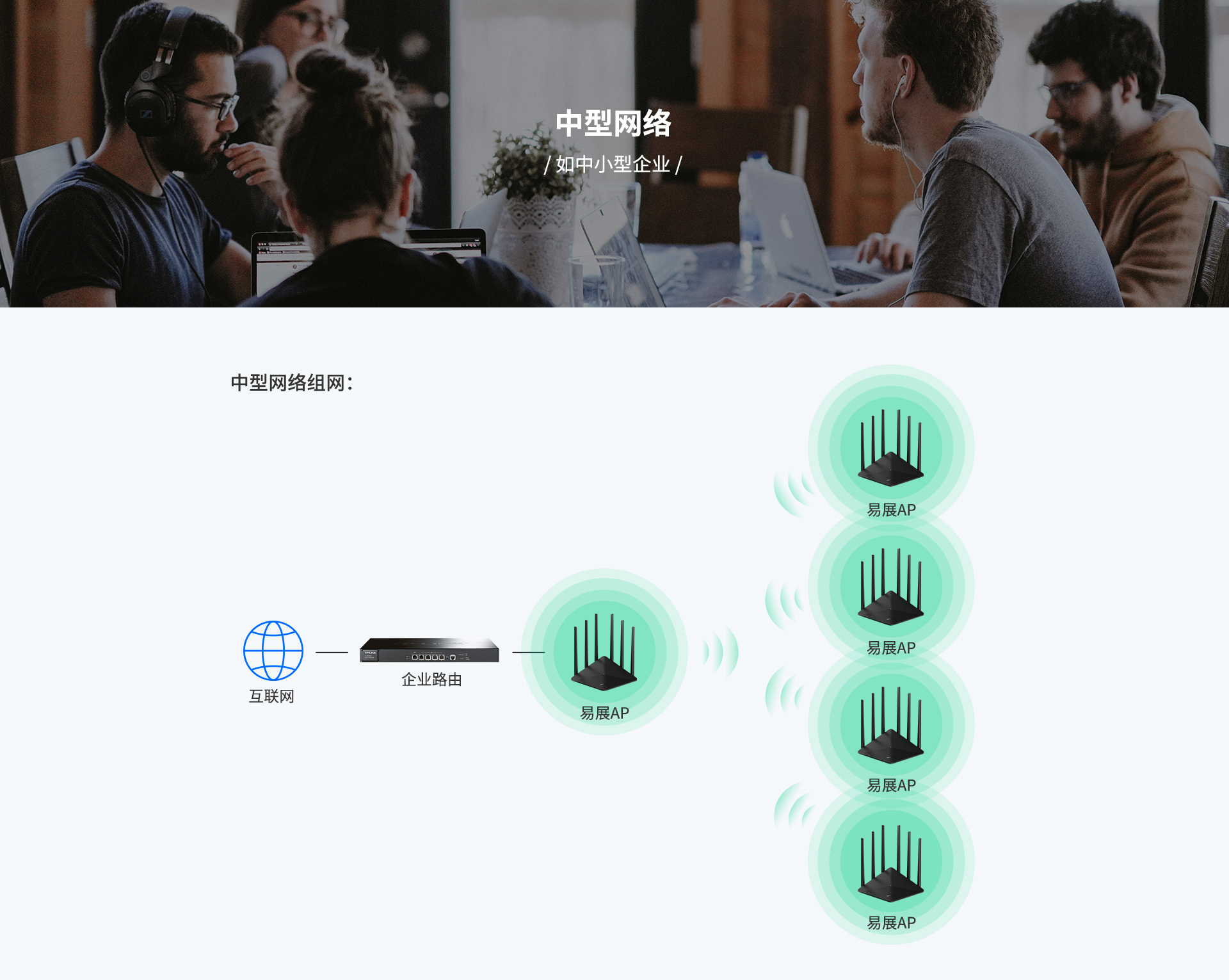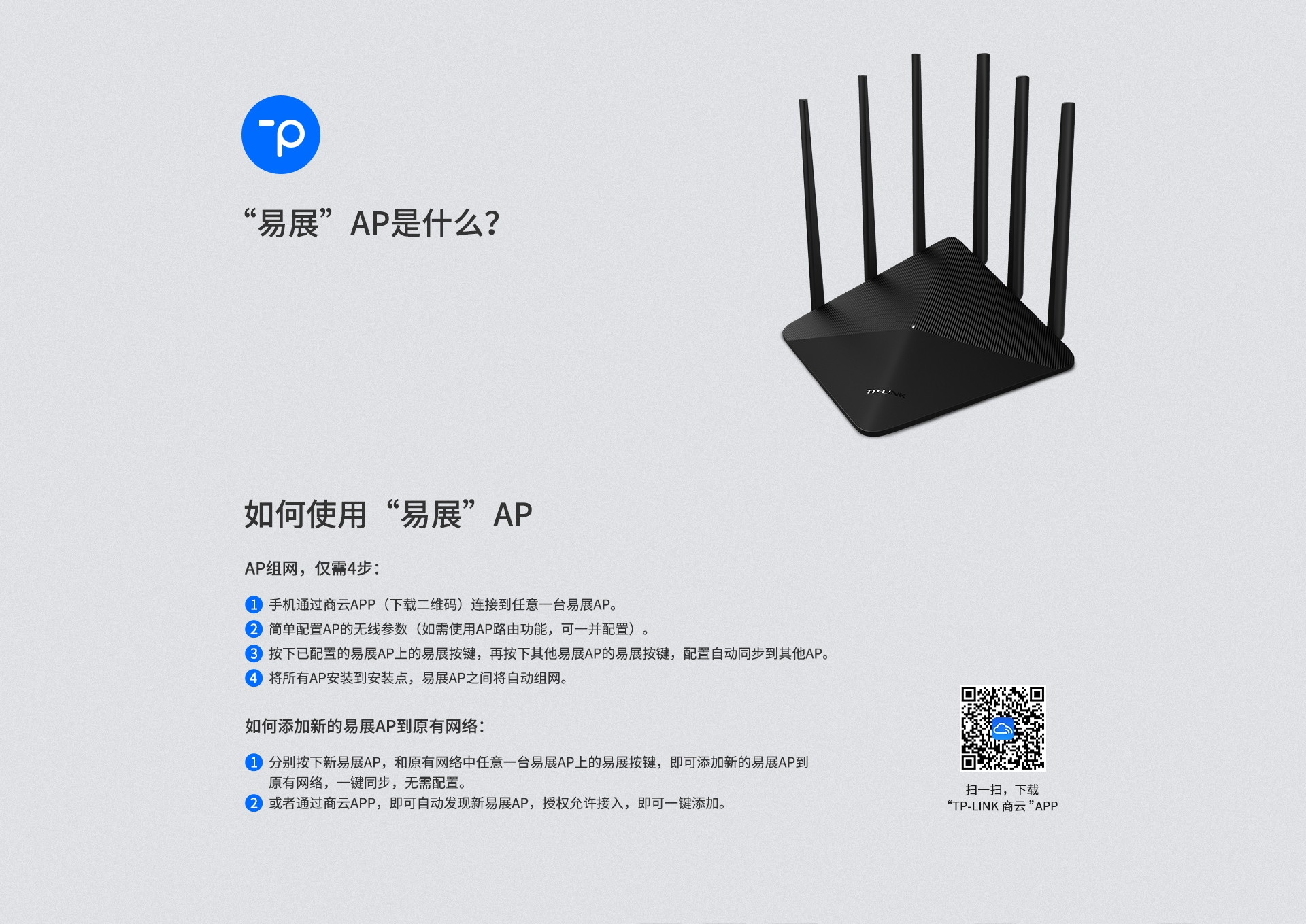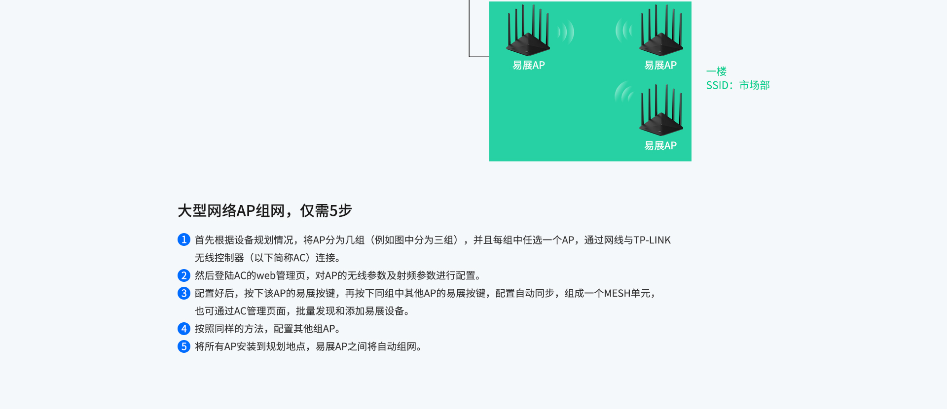 技术,无需布线,可实现最多8台“易展”AP一键无线互联。仅需简单设置单台
