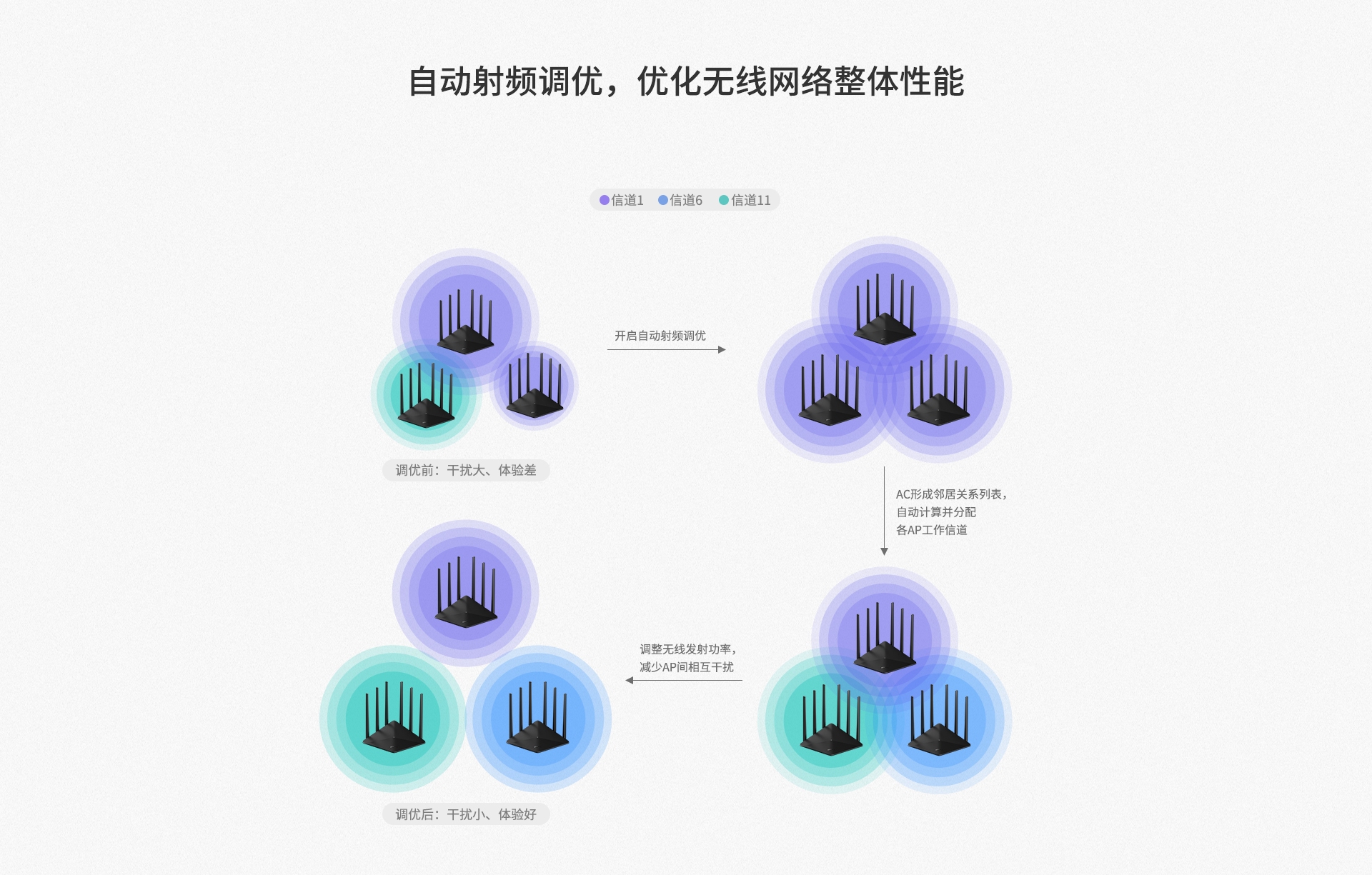 自动调整无线发射功率和信道,保证整体无线网络始终处于高速、高性能的运行状态。