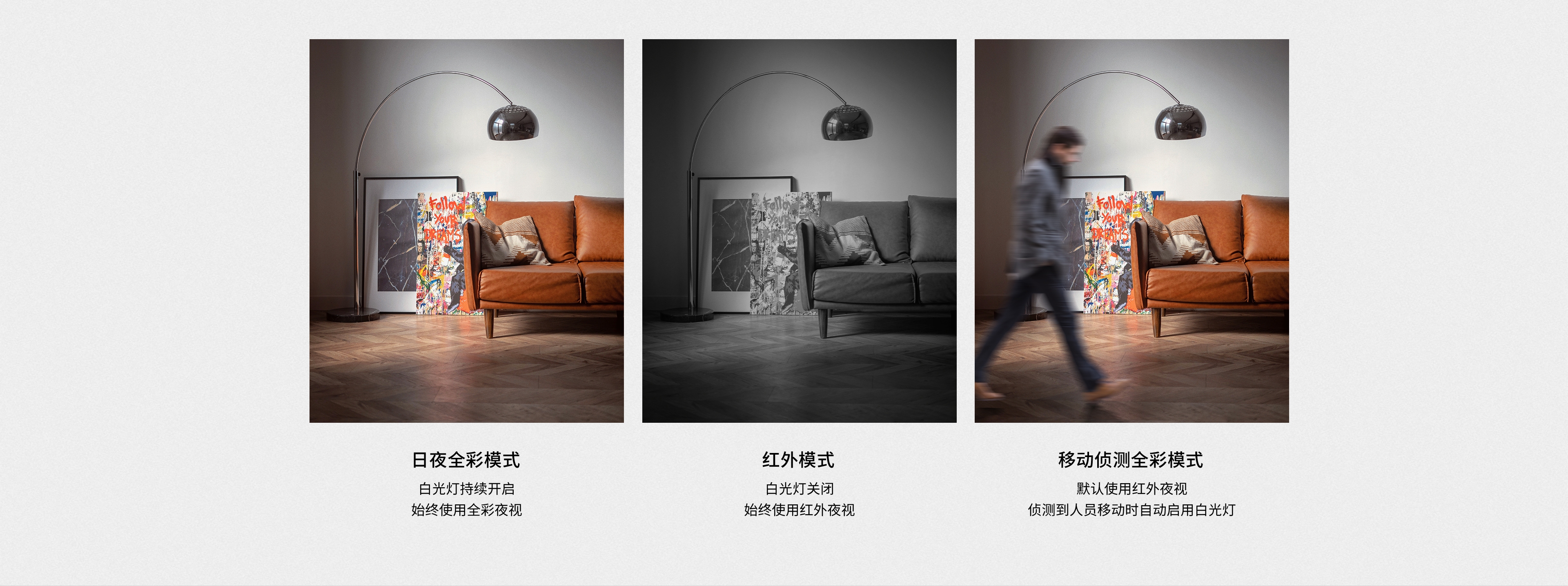 支持红外、移动侦测全彩、日夜全彩三种夜视模式。