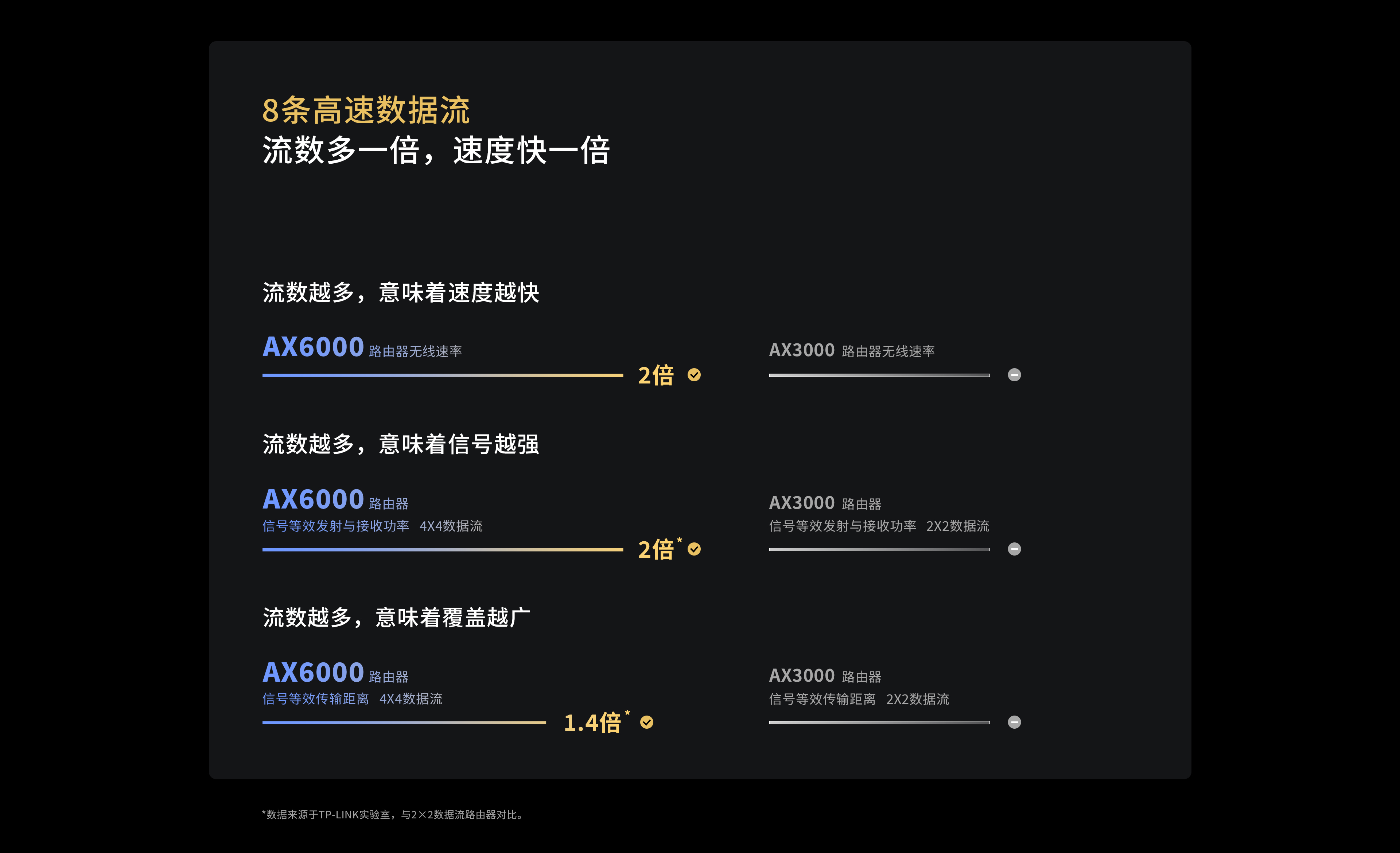 采用AX6000高速8数据流,相比市面上主流的AX3000规格的路由器(4数据流),