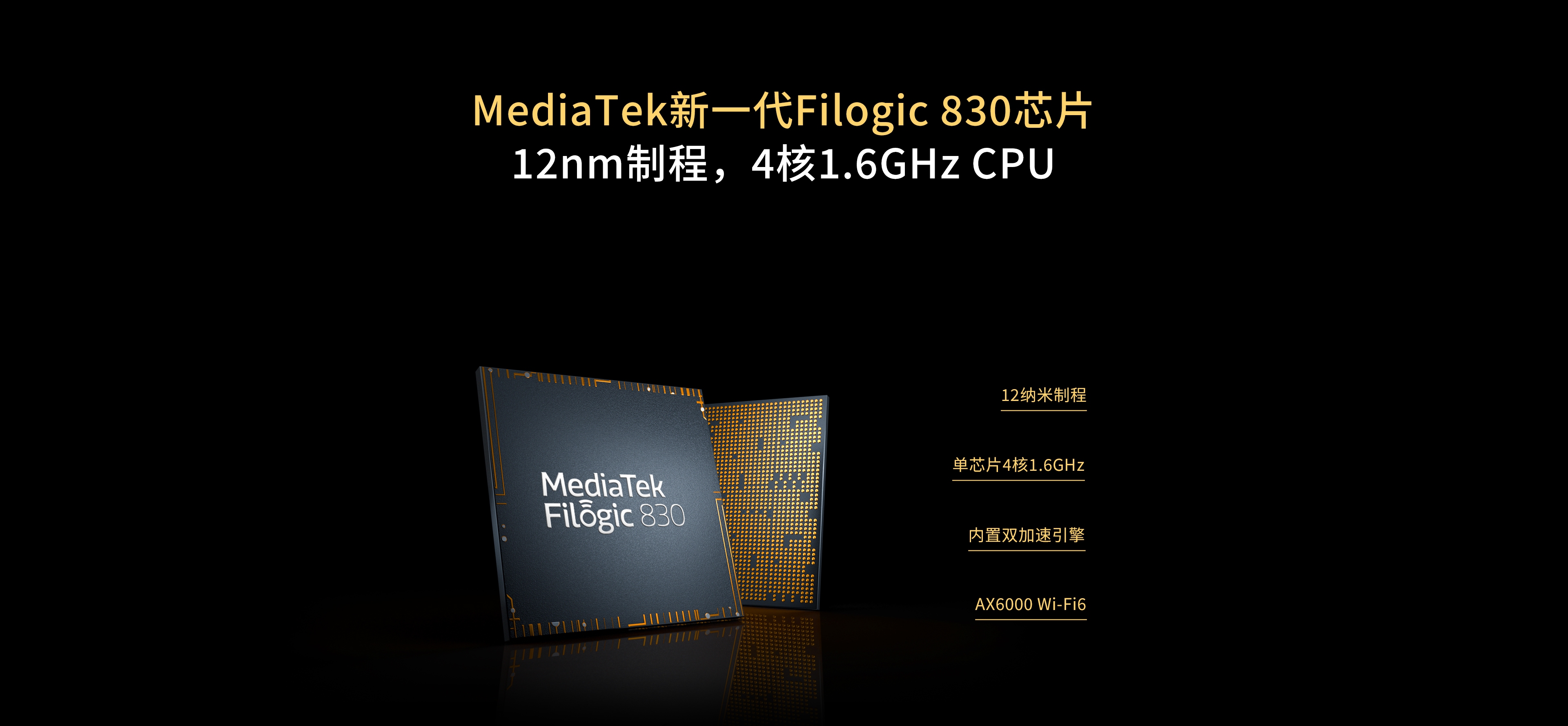采用MediaTek新一代Filogic 830芯片,先进的12nm制程,4核高性能CPU,单核主频高达 1.6GHz,