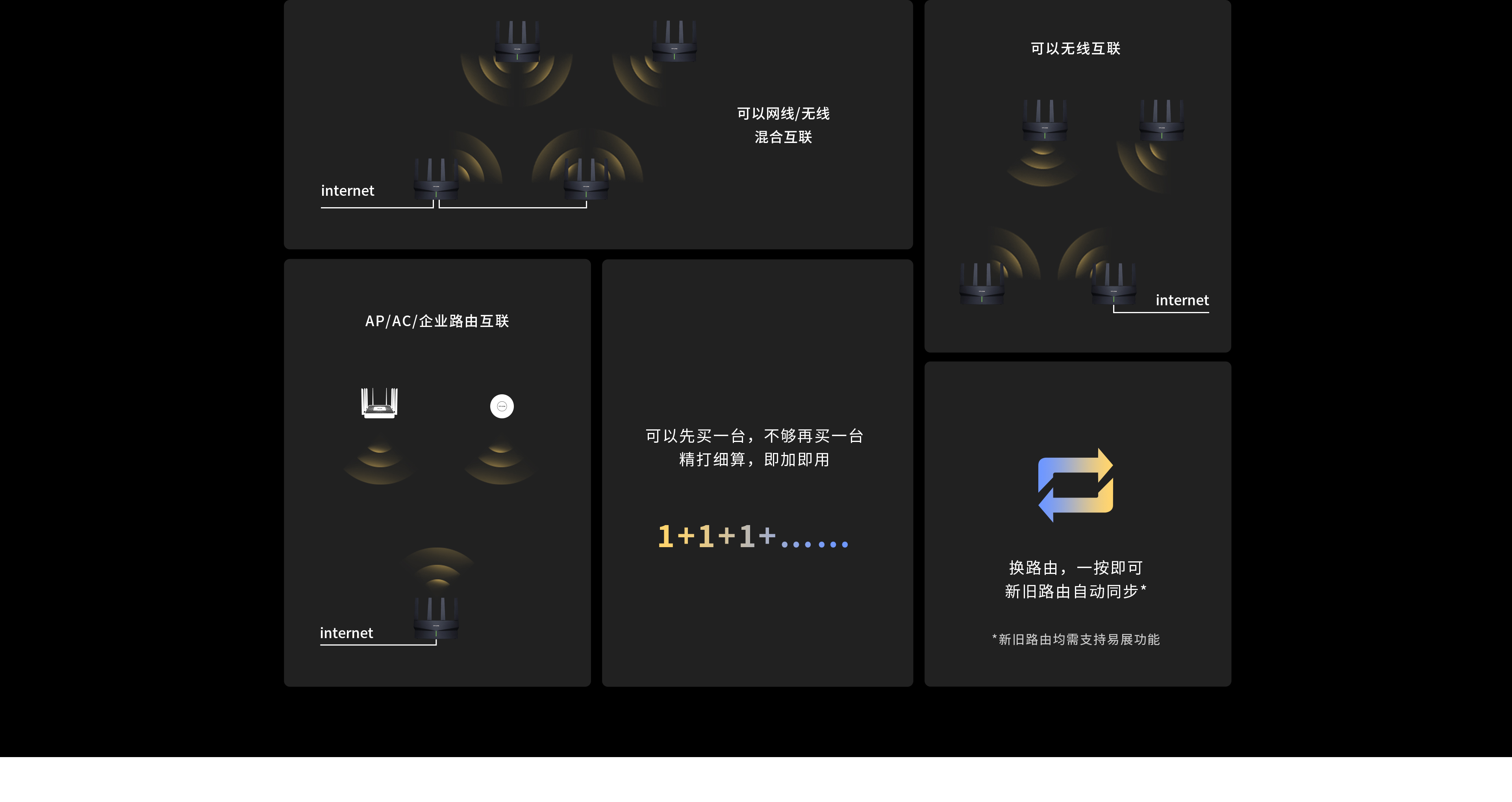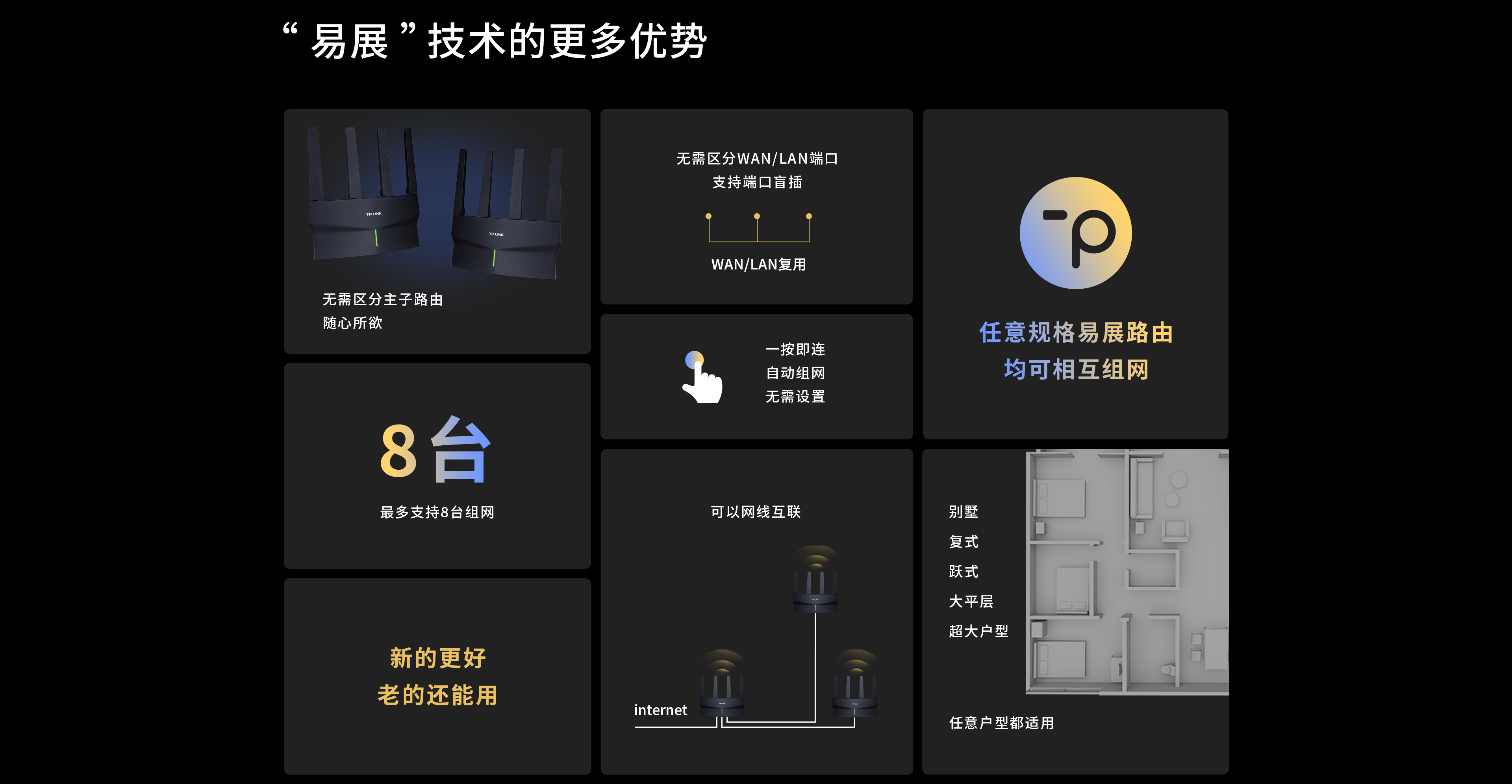 所有带有TP-LINK“易展”功能的,任何规格、任何形态,任意易展产品均可“一键互联”。