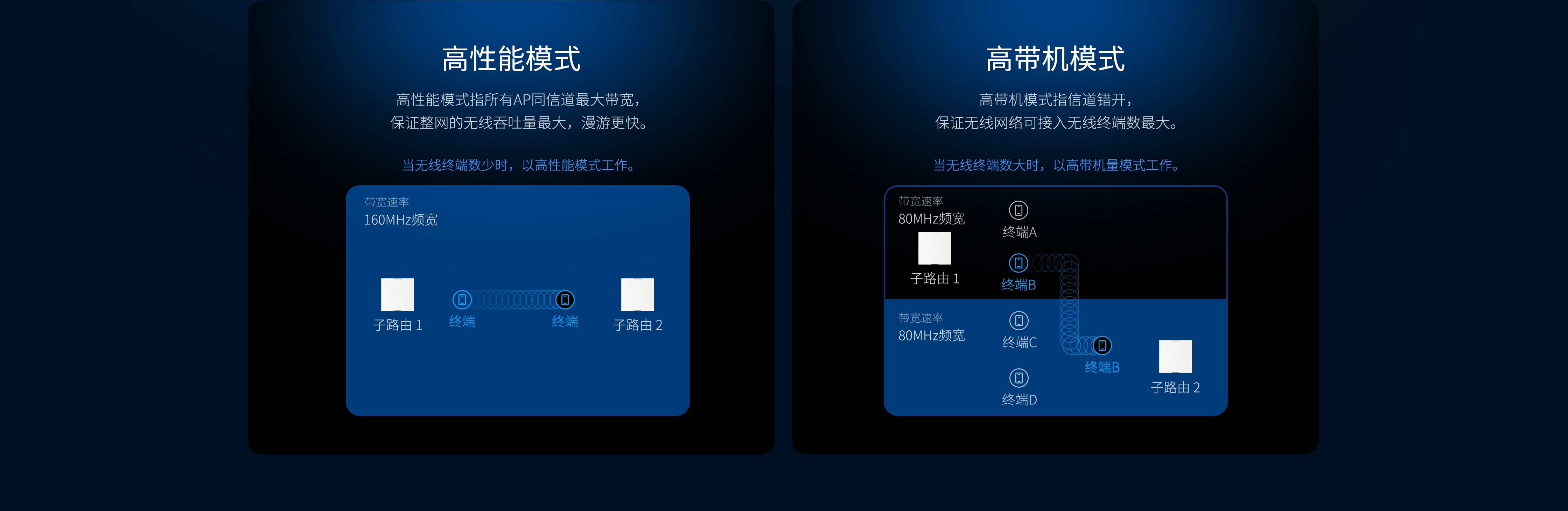 高性能模式和高带机模式可选,根据无线终端数量智能选择无线网络模式。