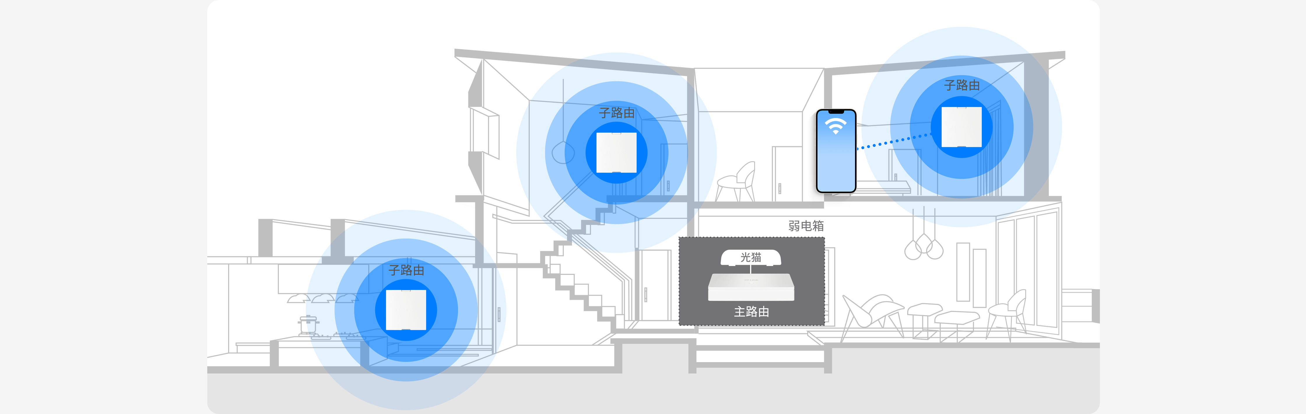 设置简单。可在各个房间布置单个子路由,由主路由统一管理,无惧墙体阻隔,消除覆盖死角,轻松无缝漫游。