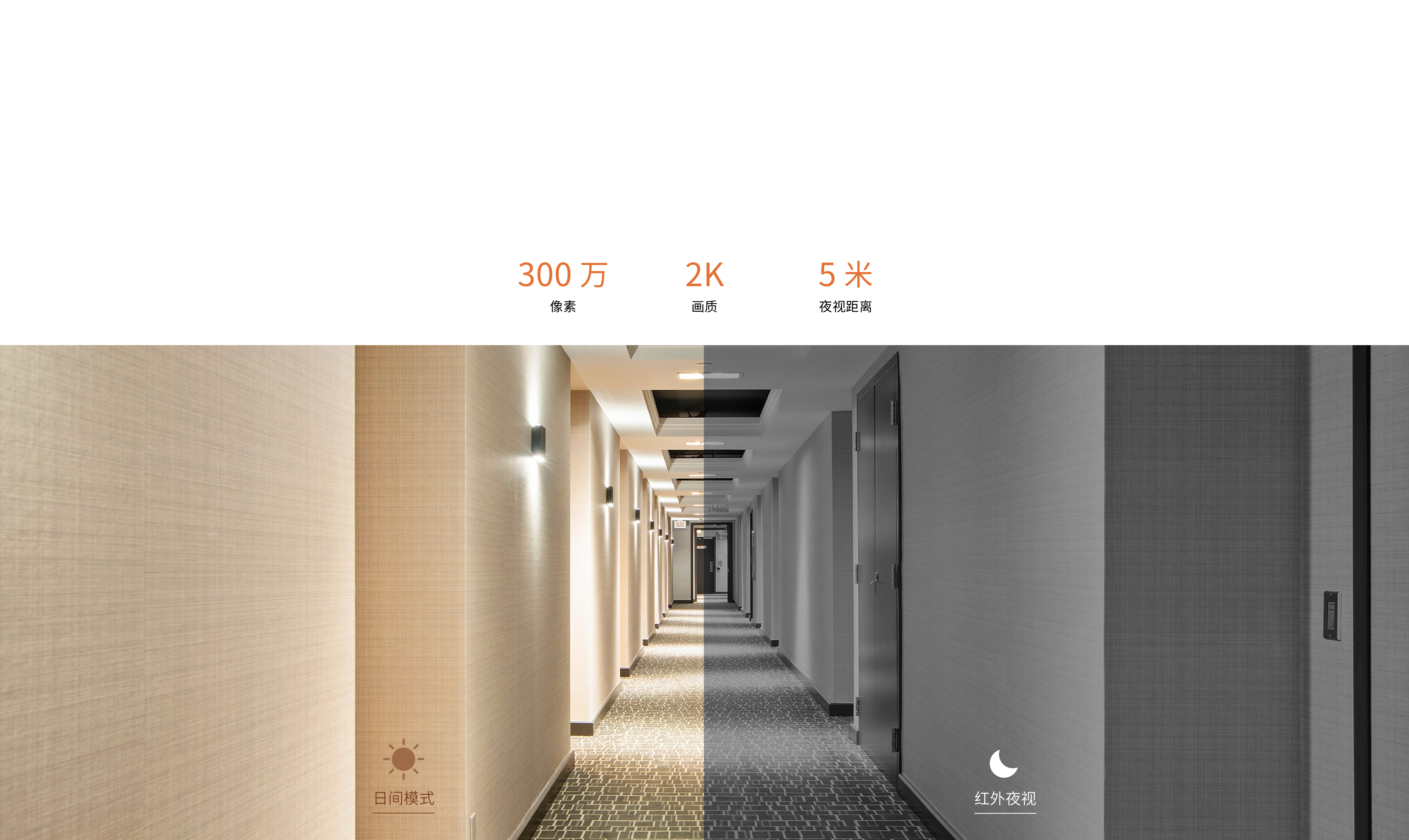 300万像素、2K画质、大广角视野。自动检测环境光线,夜视距离长达5米。
