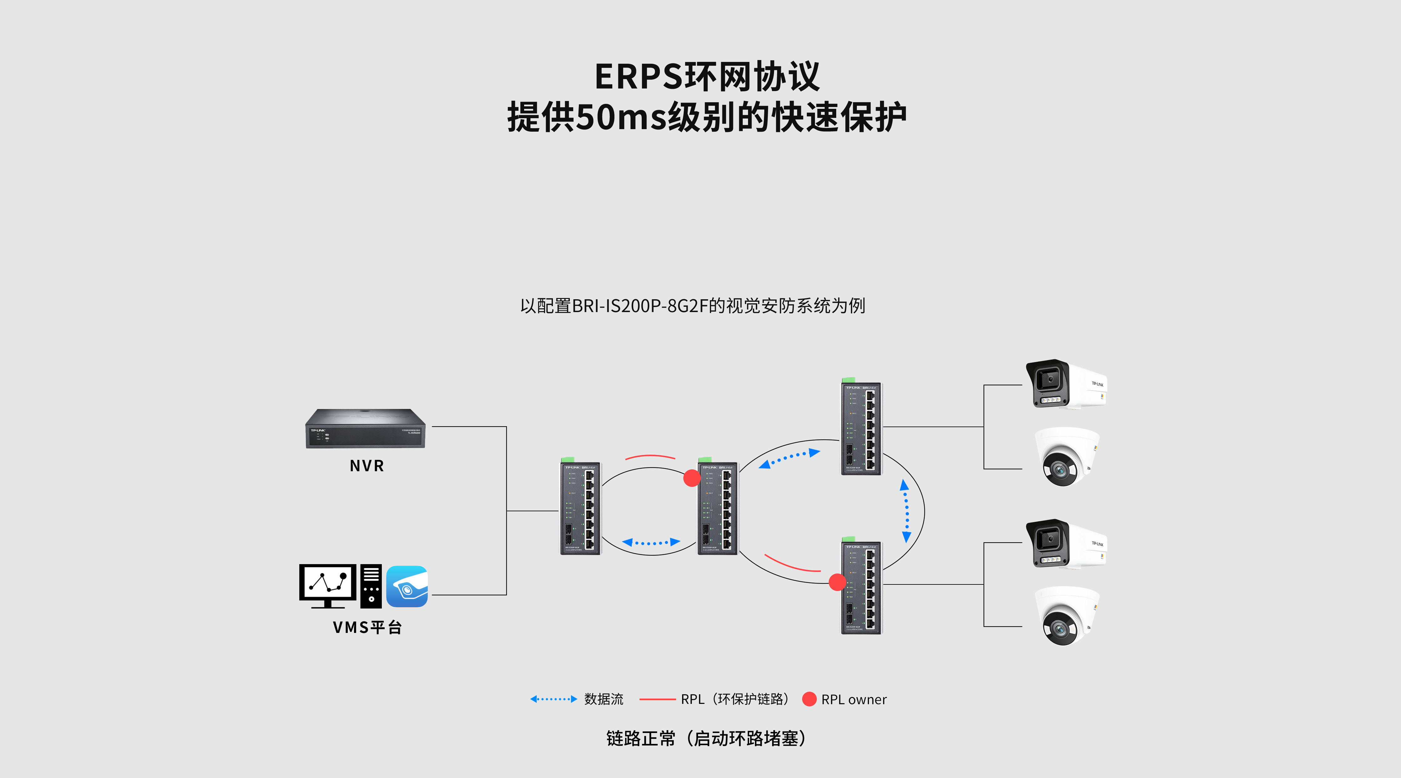 ERPS环网协议,是以太网多环保护协议。可单环、多环组网,支持快速环网(故障自愈时间