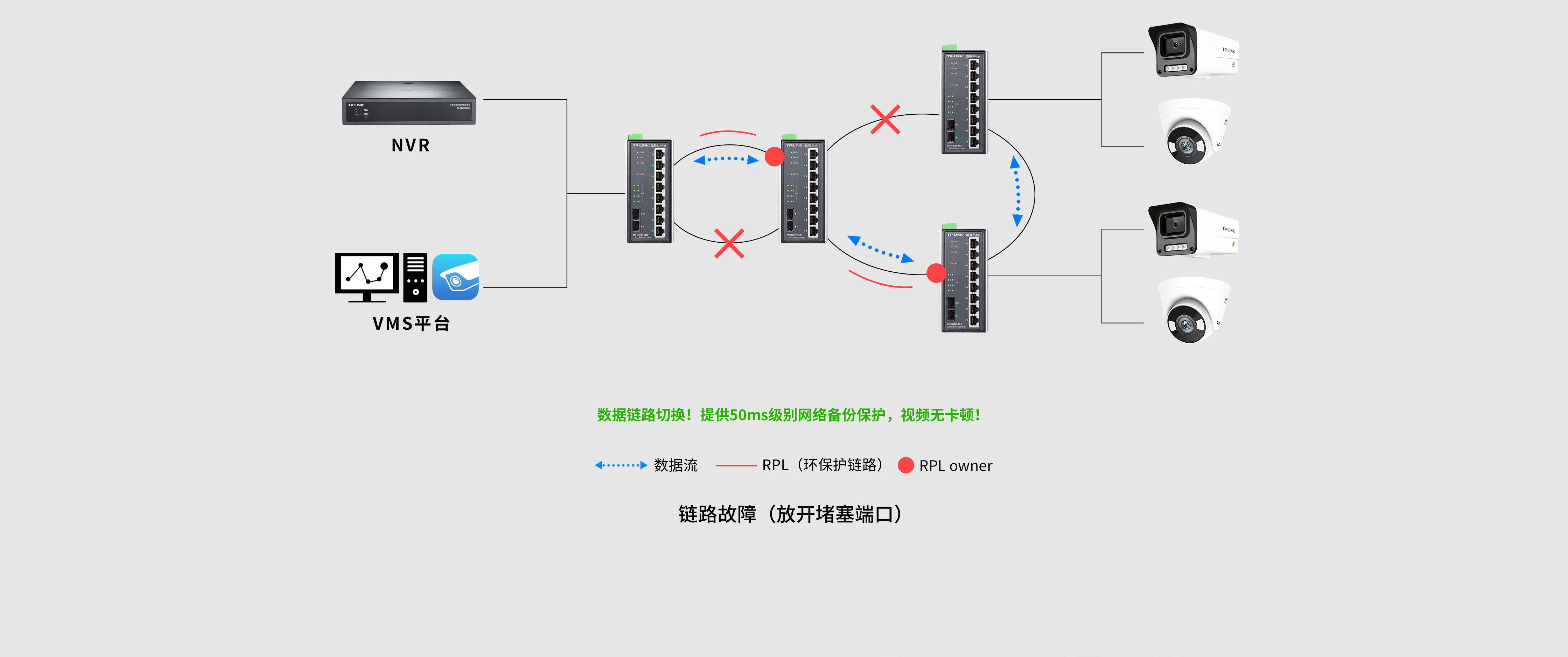 <50ms),有效避免网络环路、广播风暴等现象,保护工作数据,提高网络可靠性。