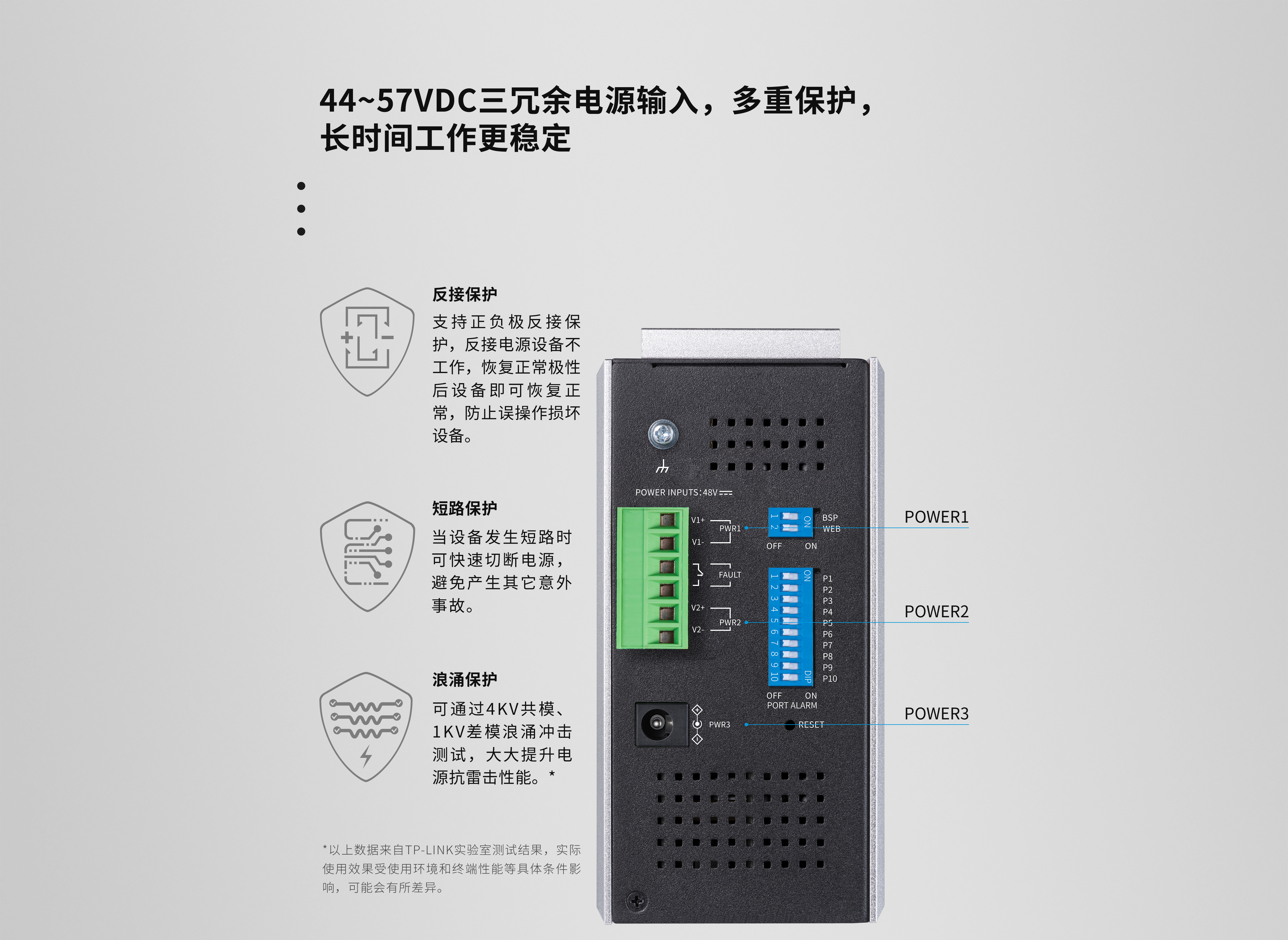 提供三种电源防护保护,大大提高交换机供电的可靠性。