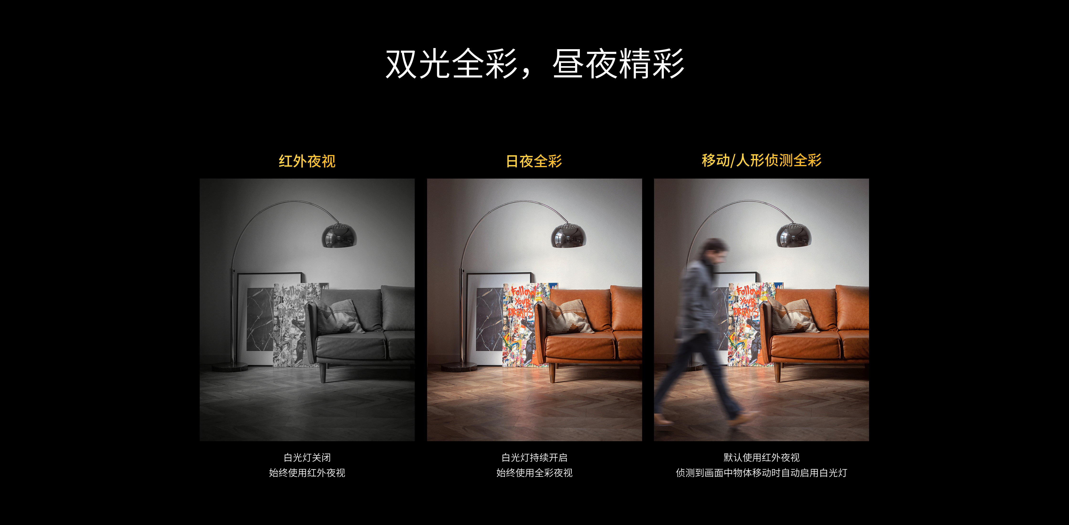 内置大功率白光灯,支持红外夜视、日夜全彩、移动/人形侦测全彩四种夜视模式。