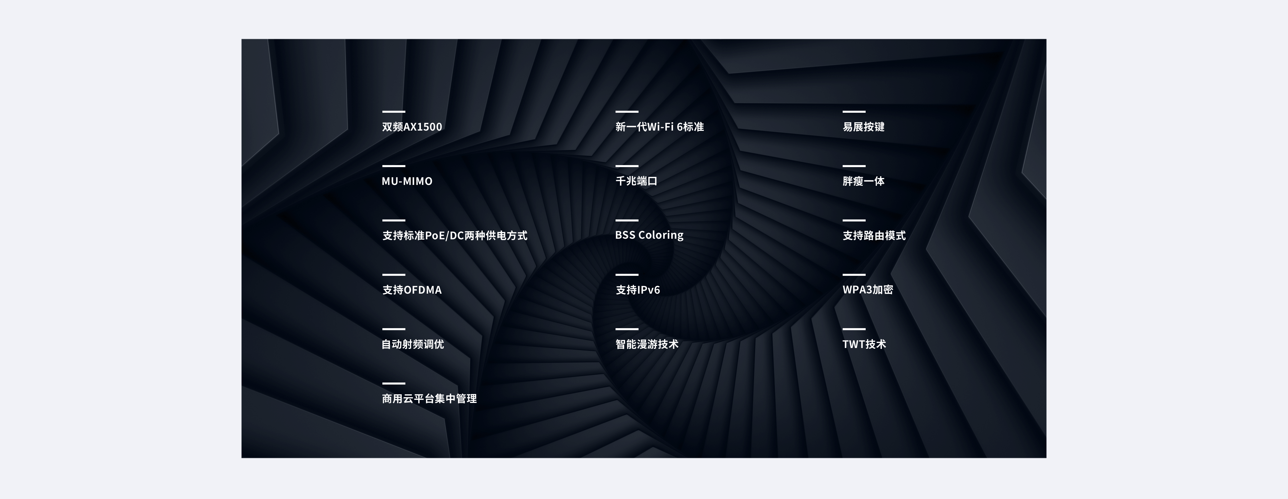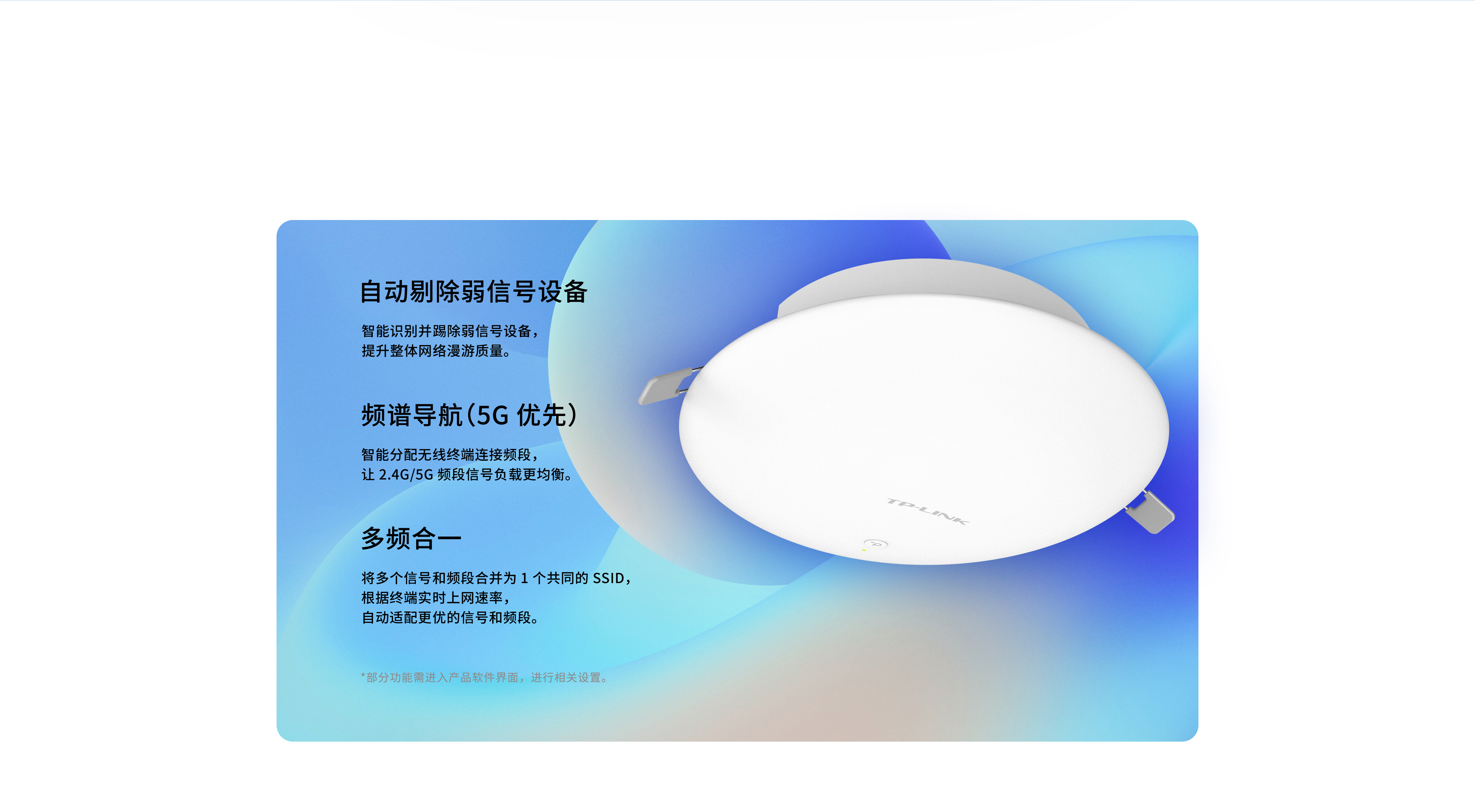 内置专为吸顶式安装设计的双频天线,将无线能量聚集在吸顶AP的正面,提高AP覆盖区域内无线信号质量;