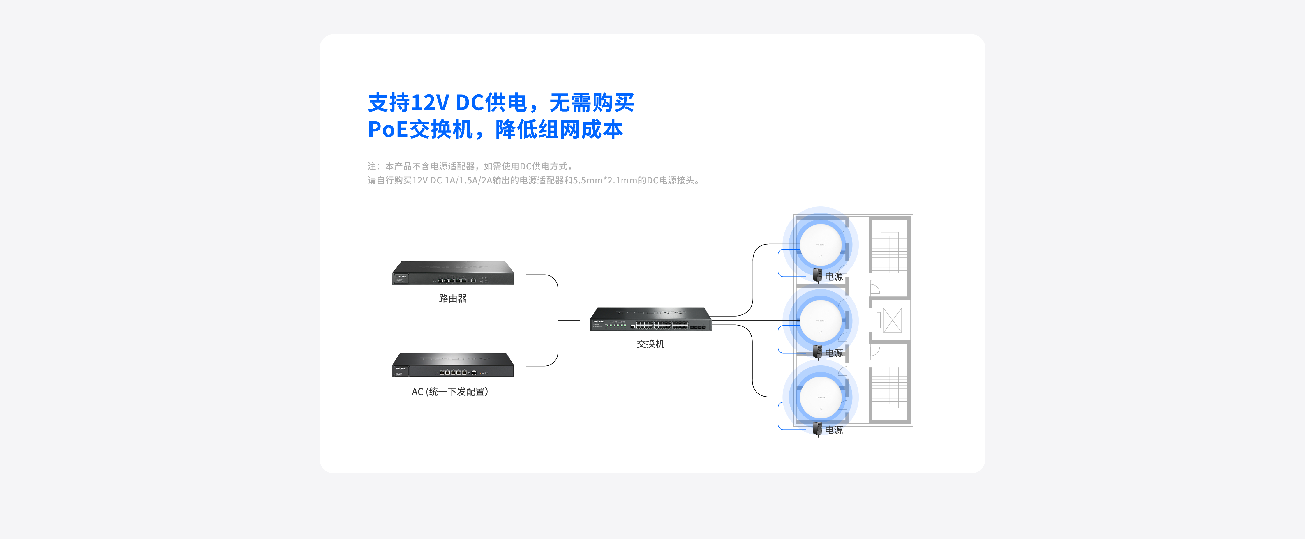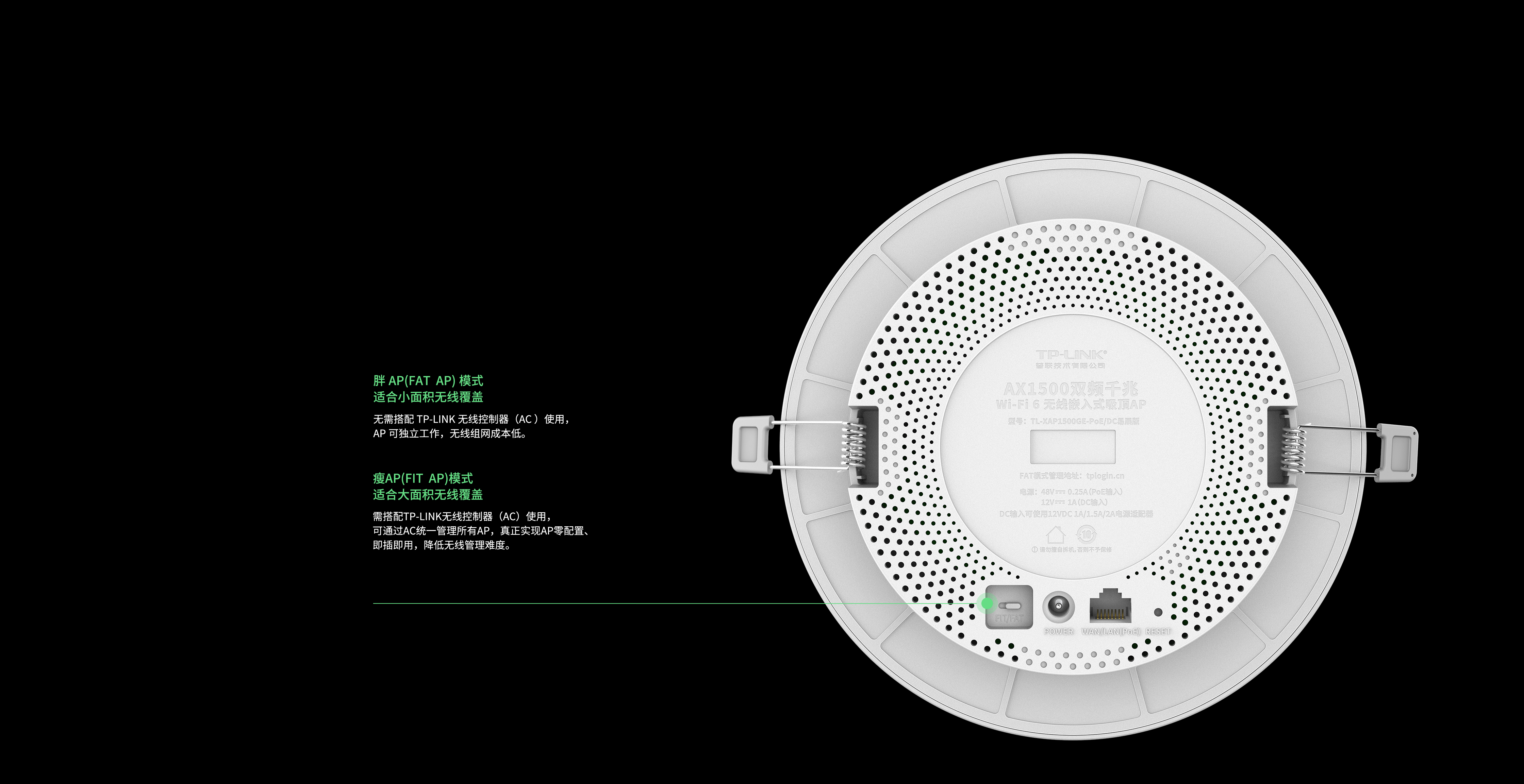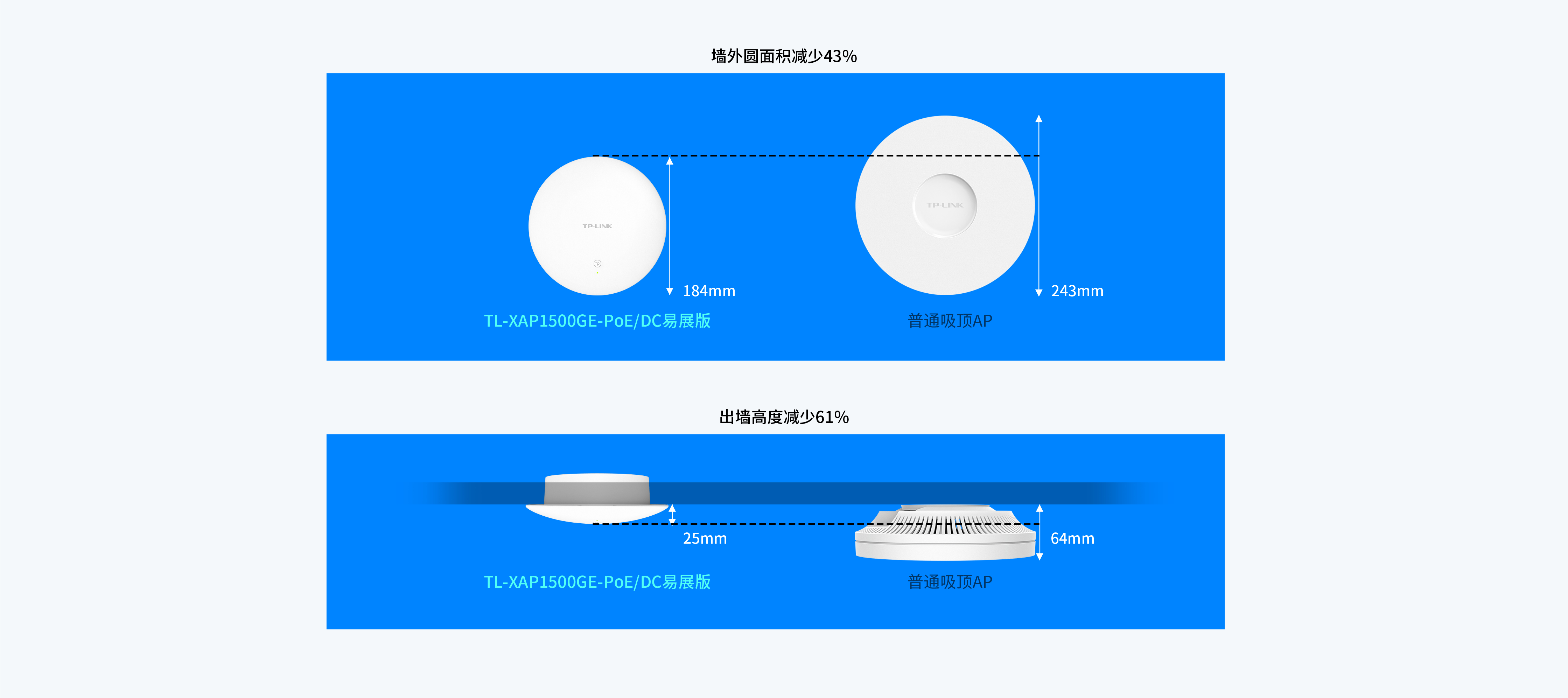 TL-XAP1500GE-PoE/DC易展版相比普通吸顶AP正面面积缩小43%,出墙尺寸减少61%