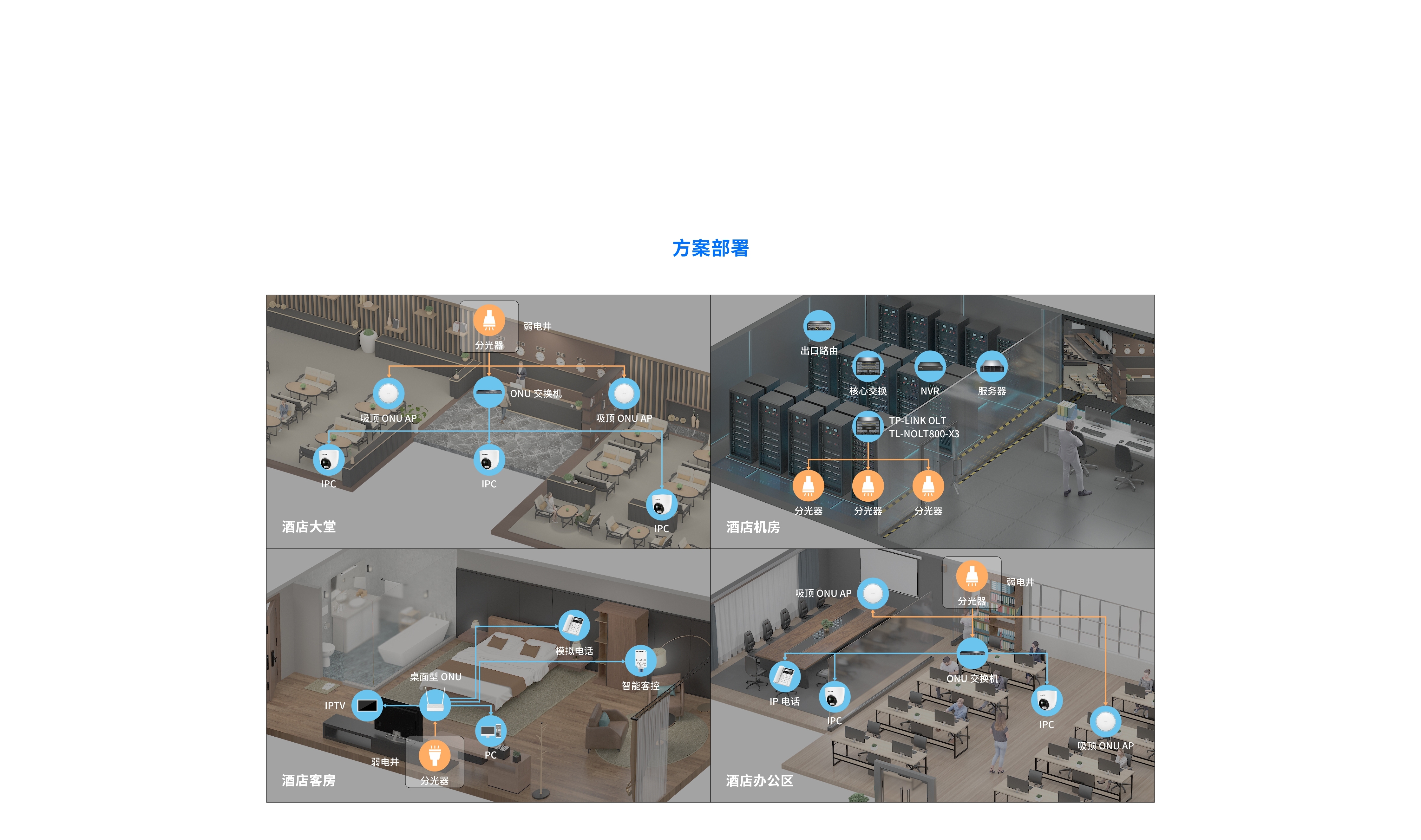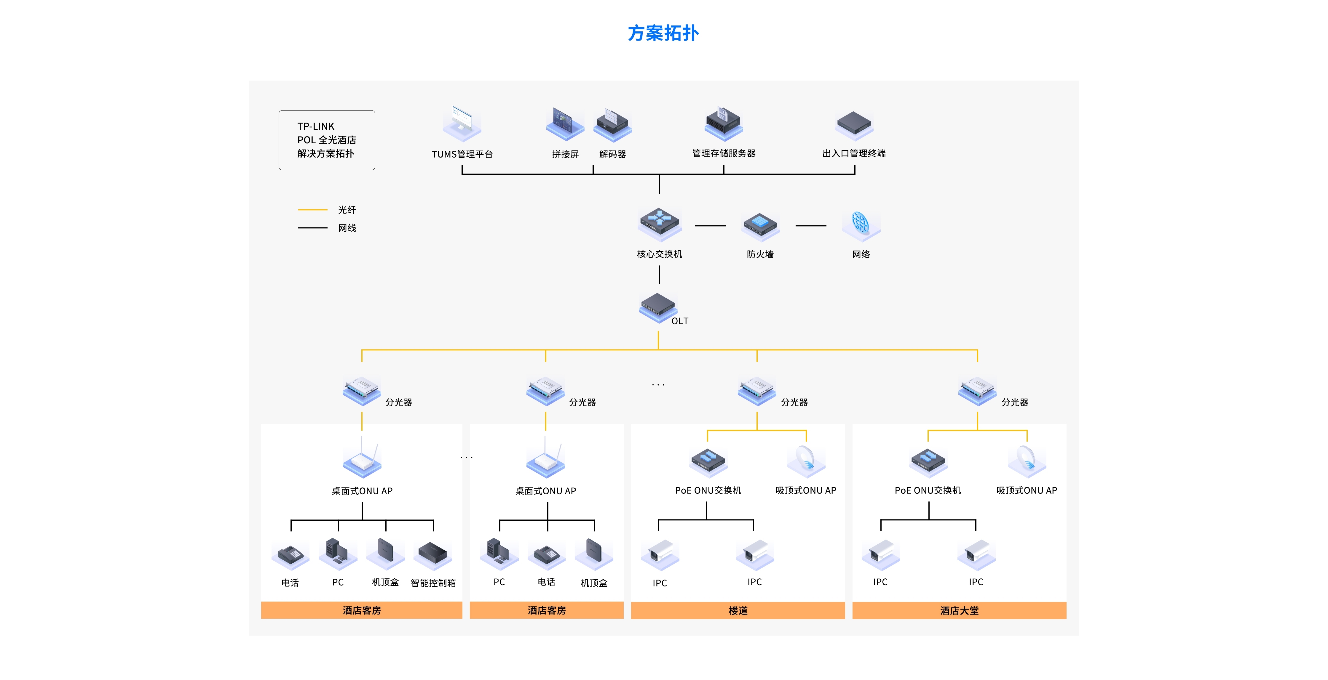 TP-LINK POL全光酒店解决方案,“一房一光纤多业务”,通过一根光纤承载宽带、电话、IPTV、Wi-Fi、