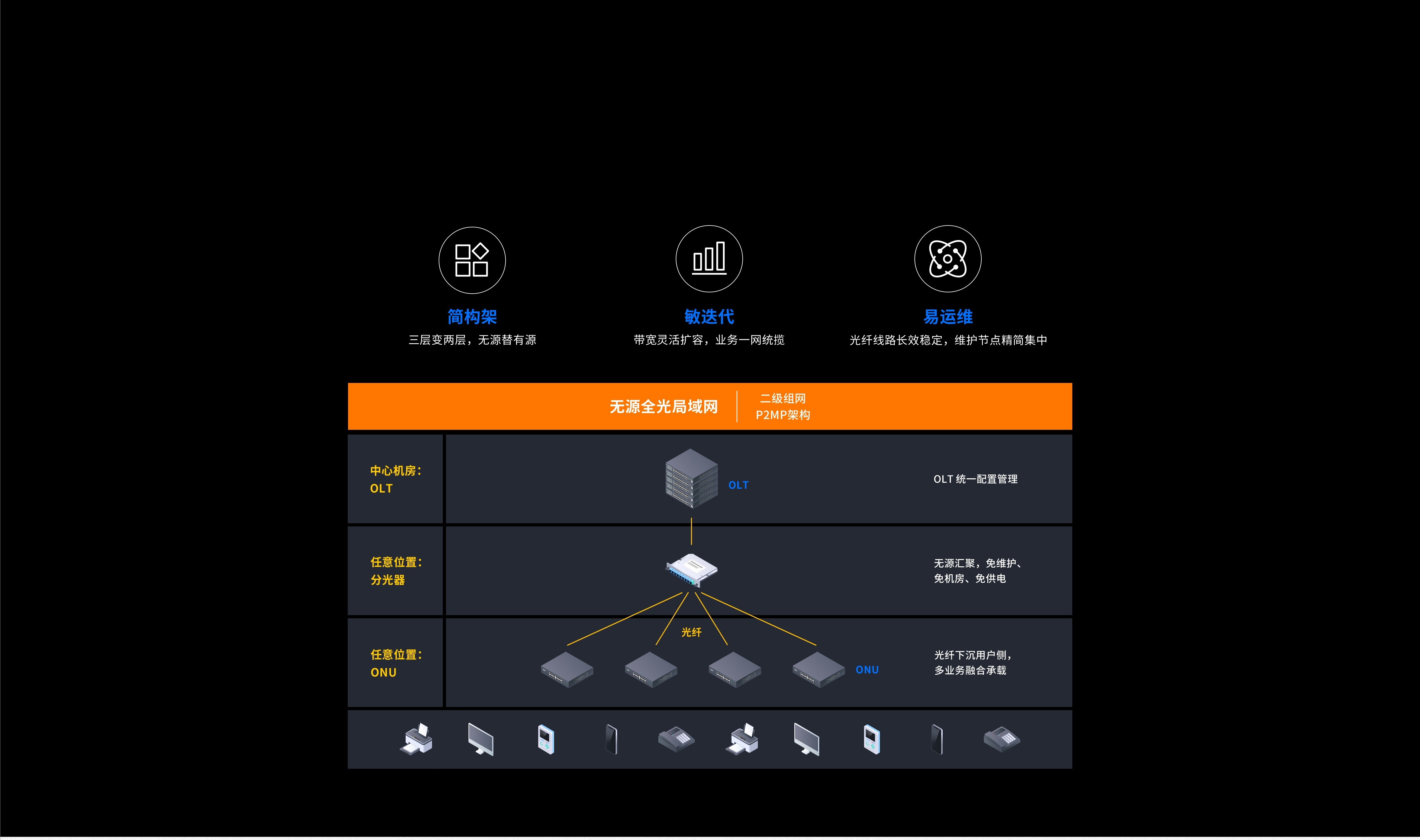 通过一张光纤网络实现多业务融合承载,通过P2MP二层架构让网络易扩展易维护,