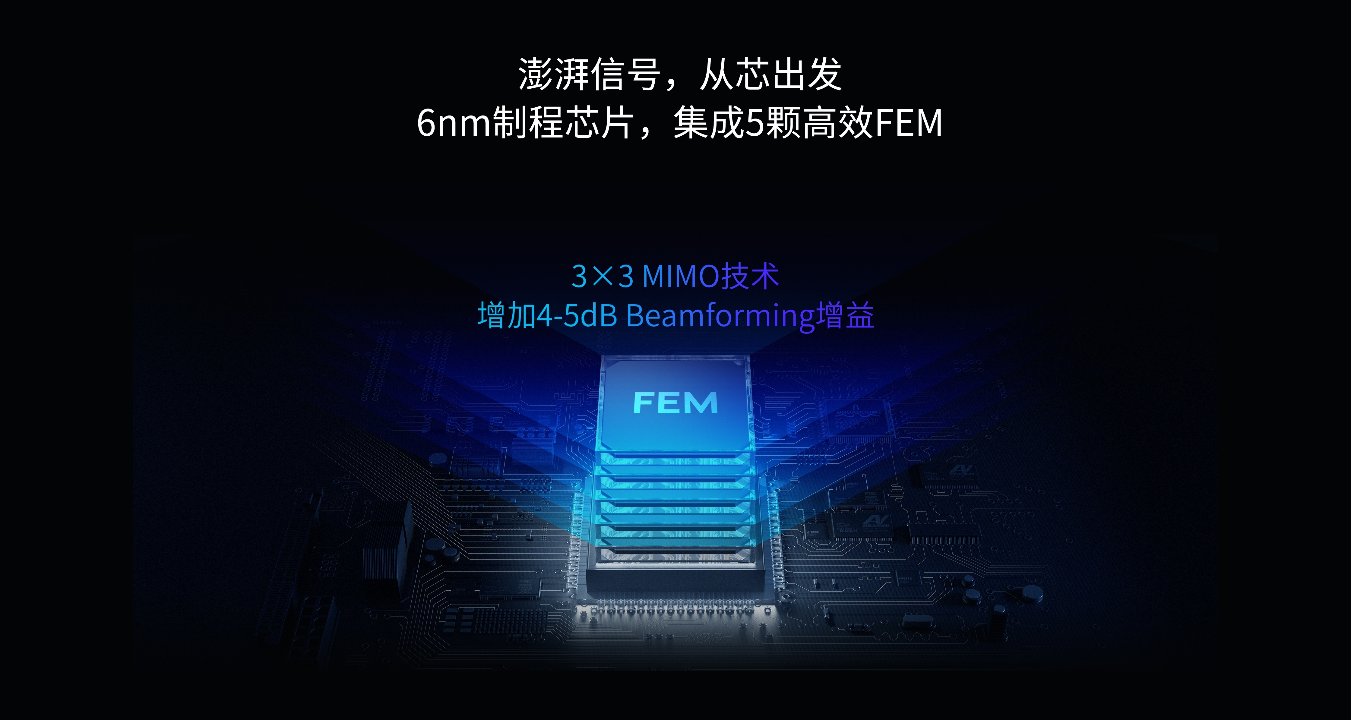 集成度更高,功耗更低,模拟芯片采用成熟芯片工艺,集成五颗高效FEM,信号更强。
