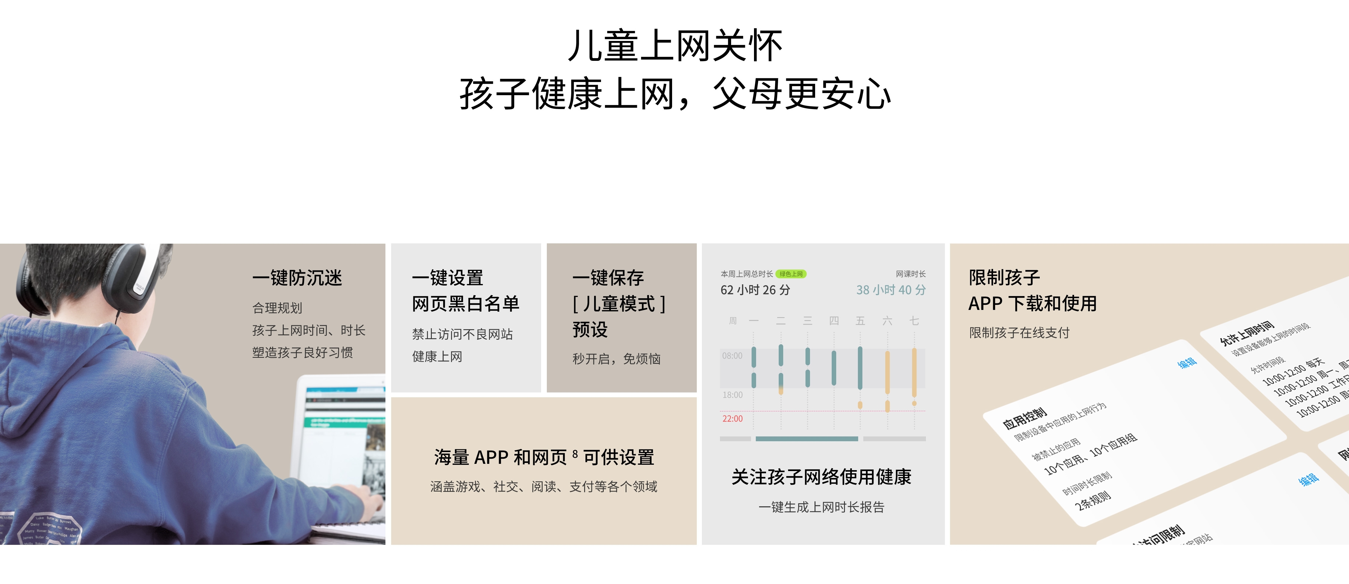 健康管理孩子上网内容,过滤不良网站,限制APP下载和使用,限制在线支付。